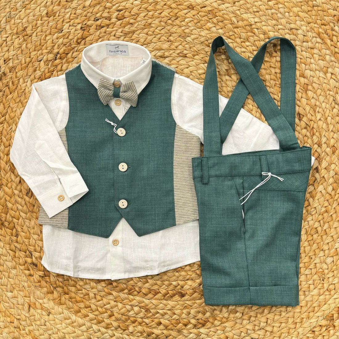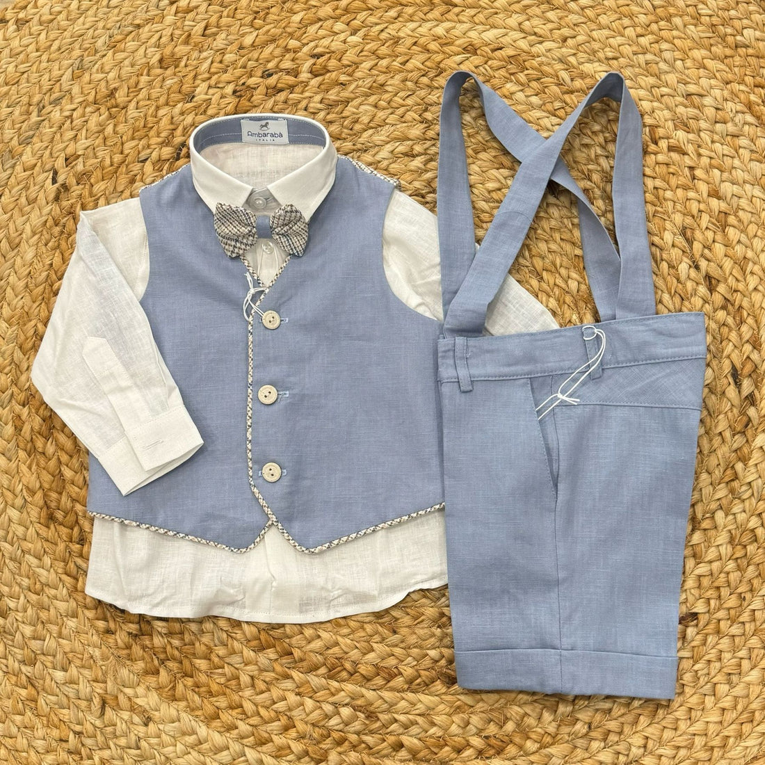 Completo cerimoniale composto da: Camicina,panciotto,pantaloncino con bretelle e papillon tutto coordinato