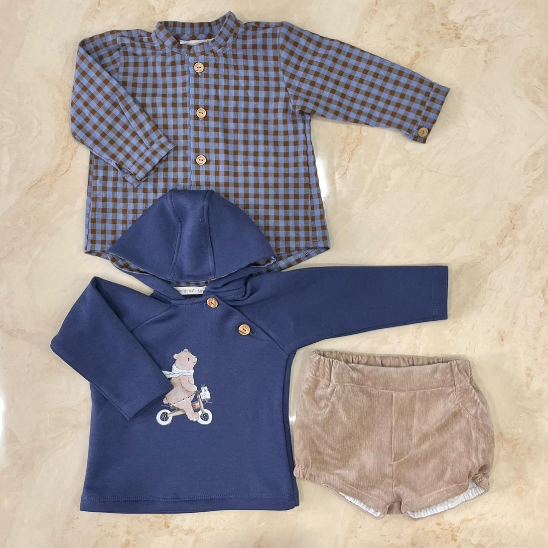 completino tre pezzi composto dafelpina con cappuccio,pantaloncino in velluto e camicina a quadricodice: HADA21