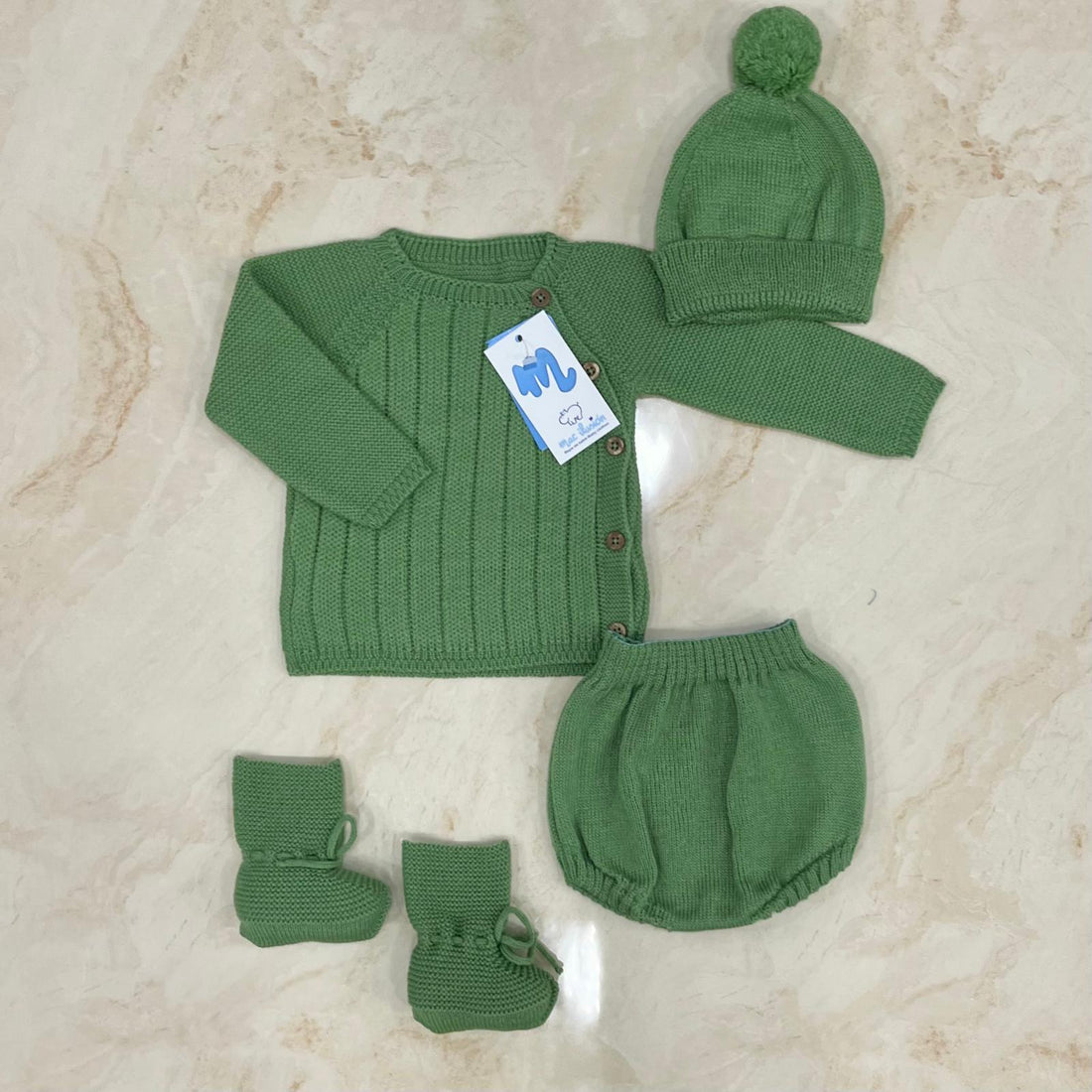 set nascita in misto lana composto da maglioncino,coulotte,scarpine e cappellinocodice: 9841