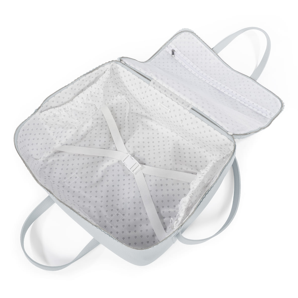 È dotata di una tracolla lunga per portarla a spalla e di due maniglie corte per un comodo trasporto a mano. Le finiture di alta qualità includono una fodera interna con elastici per mantenere i vestiti in ordine e una chiusura a cerniera bidirezionale che permette di aprire completamente il coperchio.